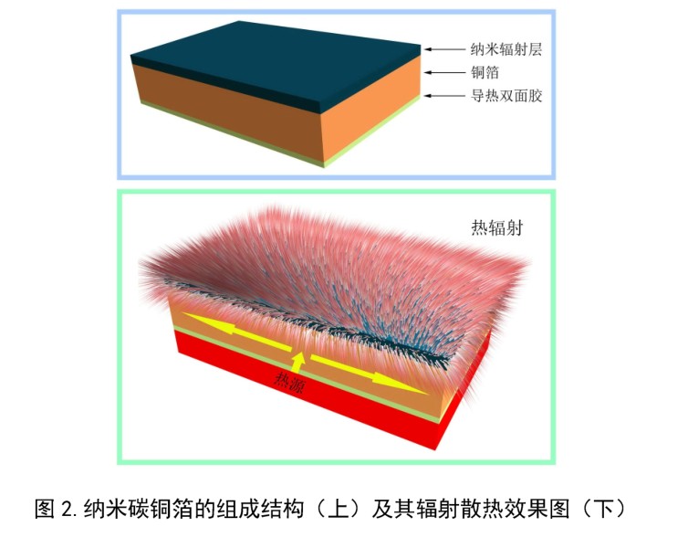 如图 2 所示,热量经本征导热性能优良的铜箔传导后,热源形态从点状向面状转变,基于纳米散热层的高热辐射性及纳米粒子的高比表面积,从而实现高效散热。