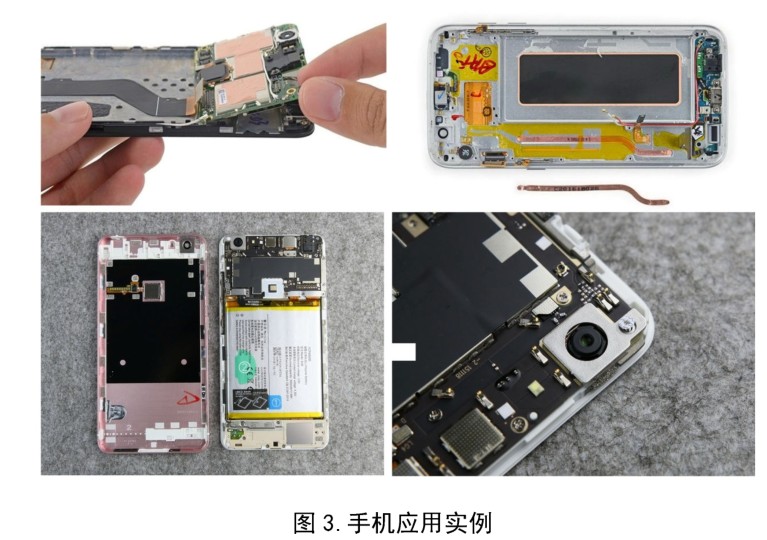 广泛应用于智能手机(如图 3)、笔记本、平板电脑以及 LED 照明等需散热处理的诸多领域。在电子元件微型化的趋势下,本产品可给予发热元件及时而高效地散热,从而显著提高其稳定性与使用寿命。