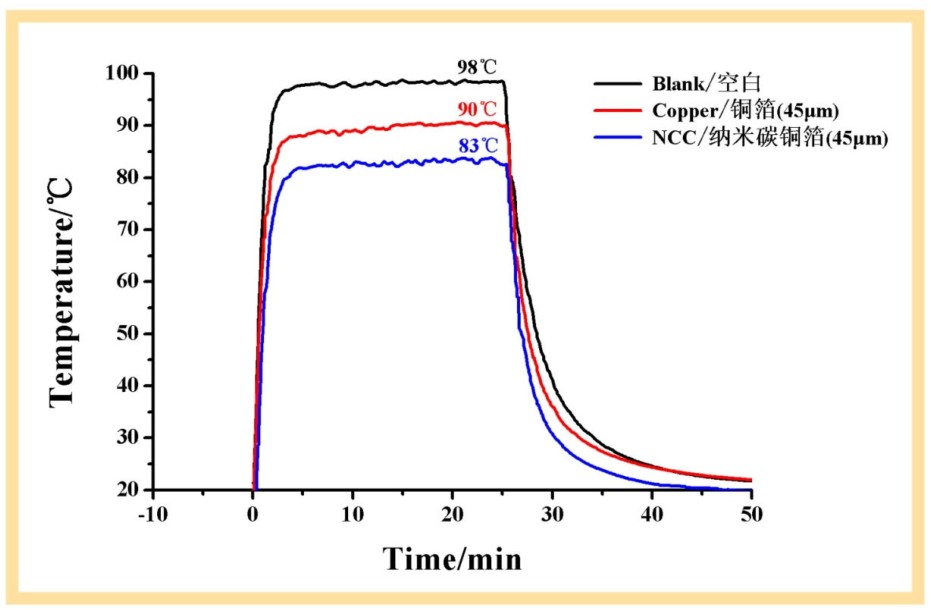 从图 5 中可以看出,未做任何处理的发热元件,稳定发热温度为 98℃;当用 45 μm 纯铜箔处理后,温度降低至 90℃;而用 45 μm 纳米碳铜箔后,温度进一步低至 83℃,说明45 μm 纳米碳铜箔对于 98℃的热源,散热效果显著,降温约 15℃。相比同厚度的纯铜箔,从降温效果观察,具有 7℃的优势。